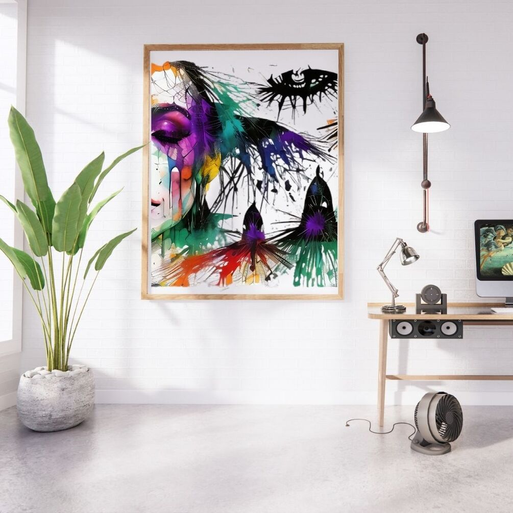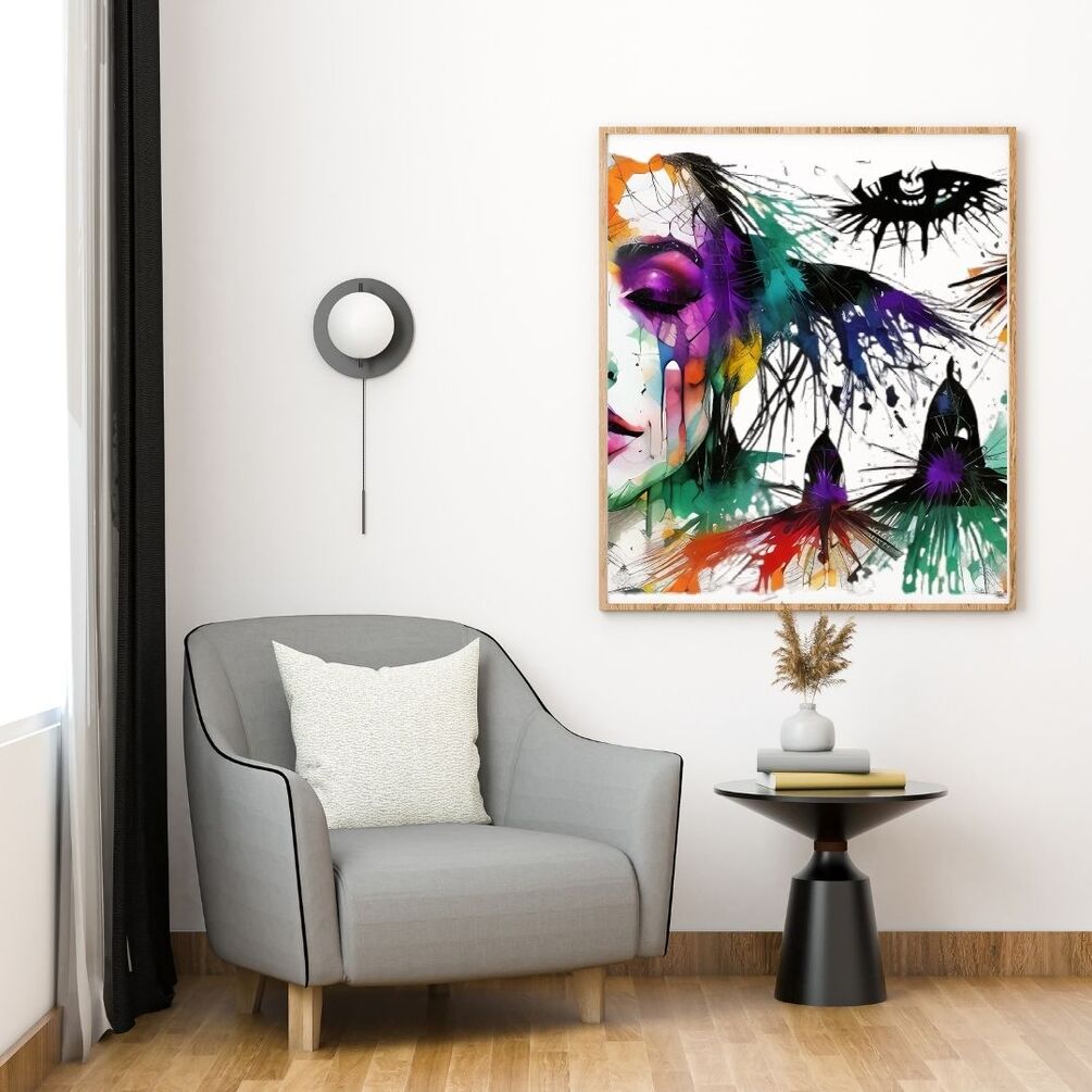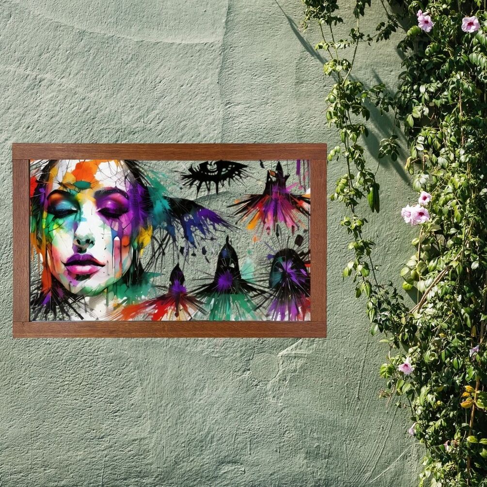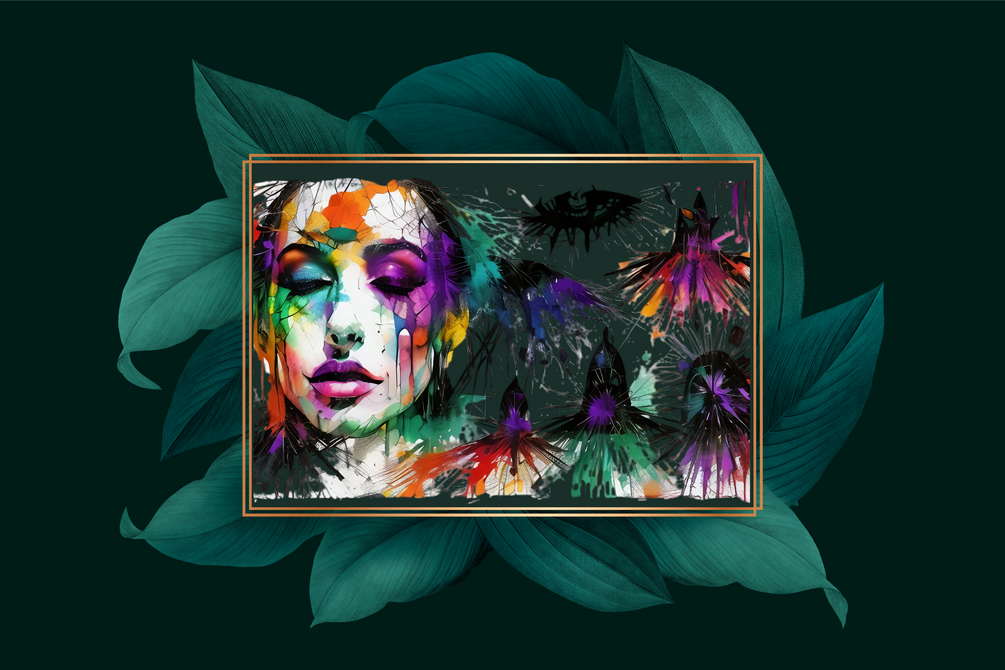 A kaleidoscope of emotions paints this woman's portrait, shrouded in shadow and color. Vivid hues and abstract strokes capture a fleeting moment of introspection, her closed eyes hinting at a world unseen. Light and darkness dance in this captivating portrait, inviting us to explore the depths of her hidden thoughts and emotions and decipher the story within.